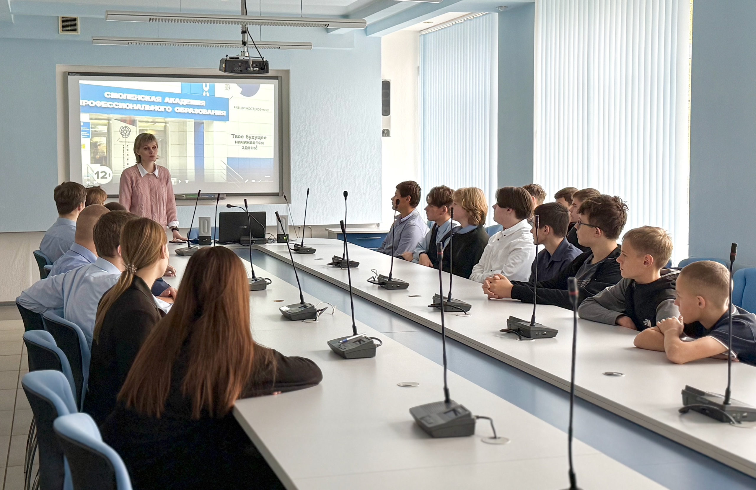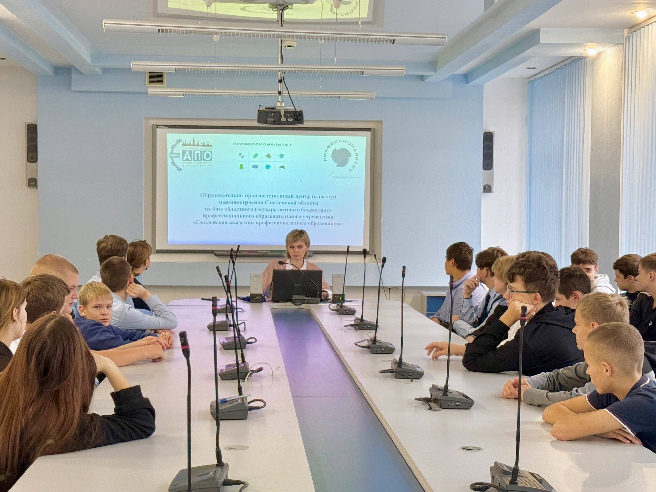 В рамках единого дня открытых дверей начальник отдела профориентации и дополнительного образования СмолАПО Семёнова Ольга Николаевна и амбассадоры «Профессионалитета» рассказали школьникам о современной системе среднего профессионального образования, преимуществах федерального проекта «Профессионалитет», а также о СмолАПО как о базовой организации образовательно-производственного центра (кластера) машиностроения Смоленской области, созданного в рамках данного федерального проекта, а также как о сетевой образовательной организации кластера «Педагогика».