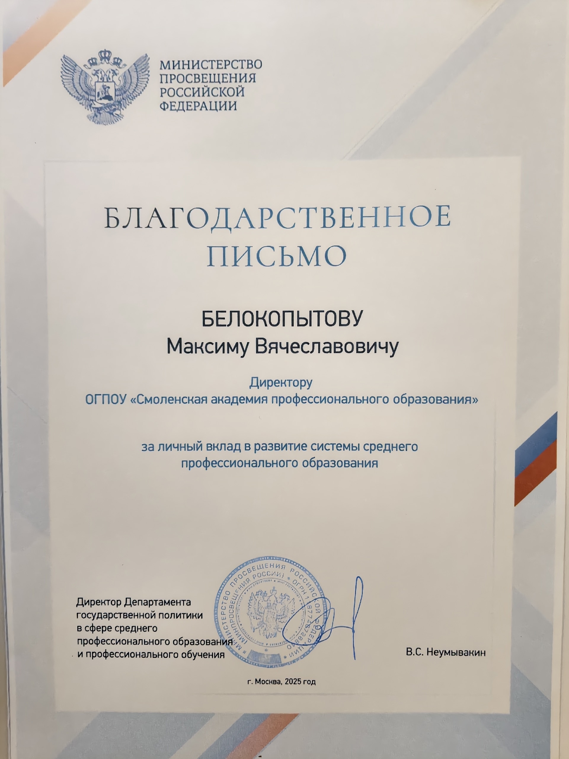 Директор СмолАПО Белокопытов Максим Вячеславович получил благодарственное письмо Министерства просвещения Российской Федерации